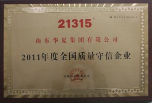 山東華夏集團(tuán)有限公司被中國(guó)產(chǎn)品質(zhì)量協(xié)會(huì)評(píng)為“國(guó)家級(jí)征信企業(yè)”和“2011年度全國(guó)質(zhì)量守信企業(yè)”榮譽(yù)稱號(hào)